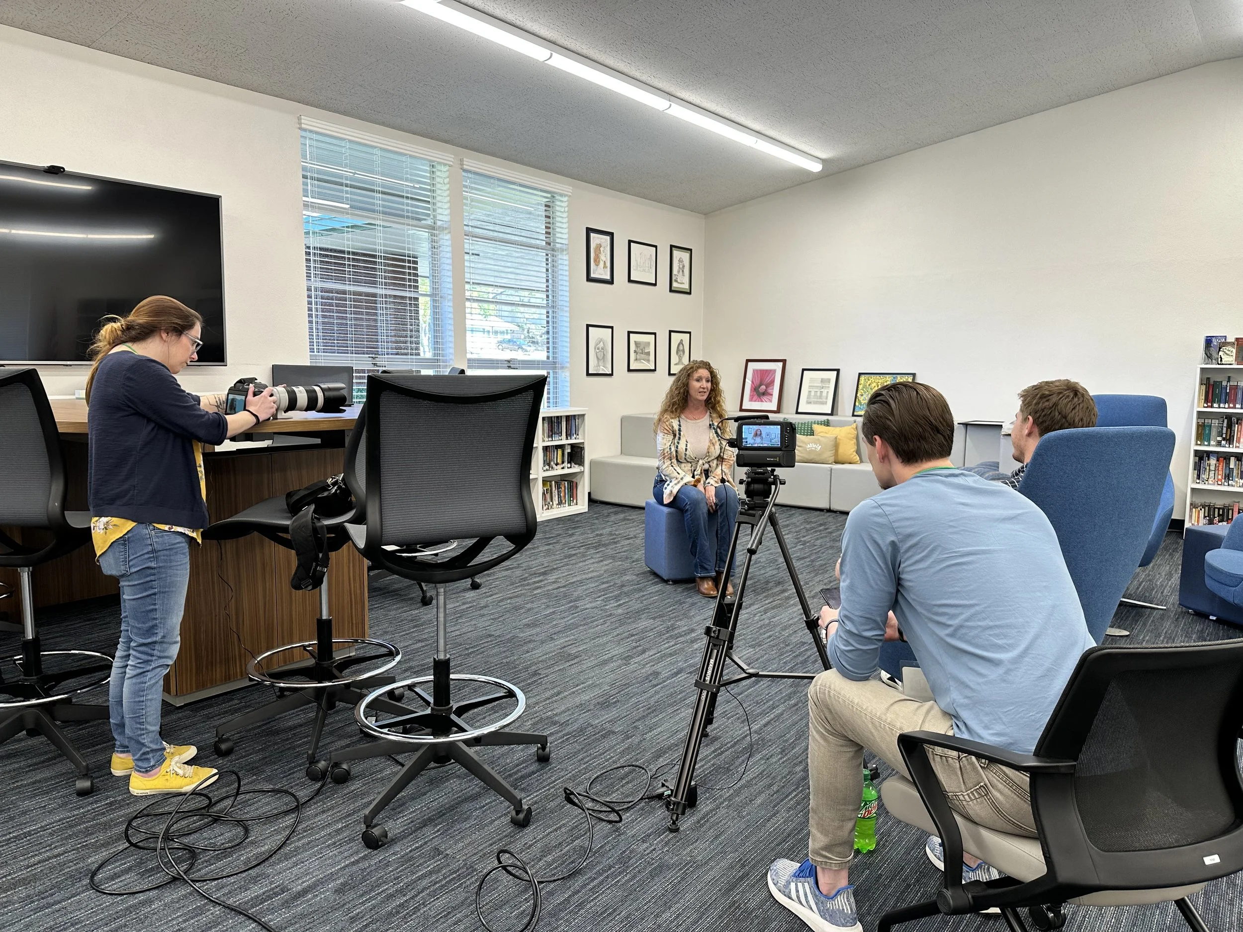 We flew in the night before the first shoot day with a crew of four people: two producers and two cameramen. When production began, we shot most of the interviews with the whole crew, giving us two camera angles and flexibility in the edit. Between interviews, we split into pairs of two to capture b-roll of different activities around the campus.